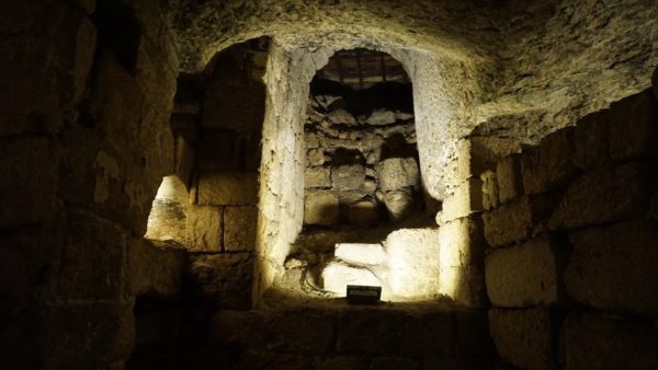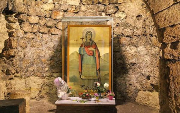 تحوي الكنيسة مغارة يعتقد بأن القديسة قد تنسكت فيه عدة اعوام عند تنقلها في المنطقة، وقد عثر على قبر هناك يعتقد البعض انها مدفونة فيه. طوال عدة اعوام، كانت المغارة تعتبر محط جذب سري للحجاج حتى فترة حكم الأمبراطور البيزنطي زينون الذي أمر ببناء كنيسة تكرم القديسة عند المقام في فترة أعوام 460-470 م.