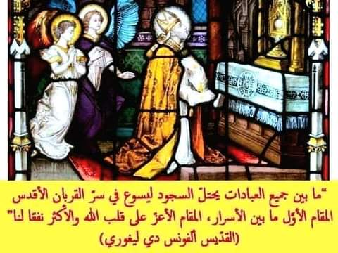 ولنا في العديد من القدّيسين مثال لتلك الممارسة التي امتدحتها السلطة التعليميّة الكنسيّة مرارًا وأوصت بها. ولقد تميّز القديس ألفونس دي ليغوري بالأخصّ في هذا المضمار، وقد كتبً يومًا: “ما بين جميع العبادات يحتلّ السجود ليسوع في سرّ القربان الأقدس المقام الأول ما بين الأسرار، المقام الأعزّ على قلب الله والأكثر نفعًا لنا”. الإفخارستيا كنزٌ لا يُقدَّر: إنها تسمح لنا أن ننهل من ينبوع النعمة نفسه، باحتفالنا بها، بل وأيضًا بالسجود لها خارجًا عن القداس. إن جماعة مسيحيَّةً تريد مزيدًا من القدرة على التأمّل في وجه المسيح، وفقًا لما اقترحت في رسالتيّ الرسوليّتين “نحو ألفية جديدة” و”ورديّة مريم العذراء”، لا تستطيع إلاّ أن تنمّي أيضًا ذلك المظهر من العبادة الإفخارستيّة، الذي فيه تتواصل وتتوافر ثمار مناولة جسد الربّ ودمه.
