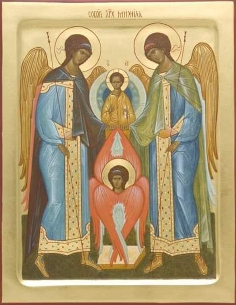 – هناك أيقونات لرئيس الملائكة ميخائيل يظهر فيها بشكل محاربٍ ويحمل بيده اليمنى سيفًا وفي يده اليسرى يافطة تعلن ضرورة التوبة والرجوع عن الخطأ.