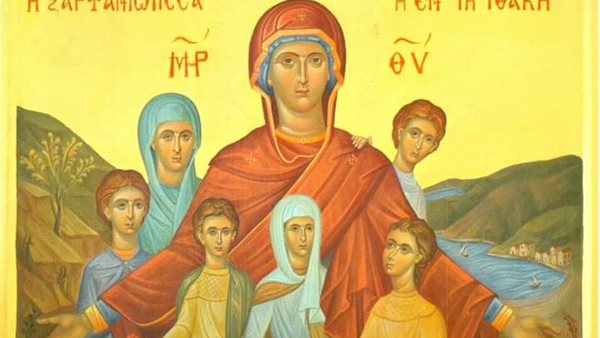الأيقونة الظاهره في المرفق هي تشكيل جديد من قبل راسم الأيقونات السيد اليشاع Tsekouras، الذي رسمها مجانا مع نصيحة و تشجيع من الأب ثيودس يصور عذرائنا بأيدي ممدودة وستة أيتام حولها. في الجزء السفلي الأيمن ميناء إيثاكا، كما يظهر من المكان الذي تقع فيه الكنيسة. أيضاً يحيط بهم البيئة الطبيعية للمنطقة كما هي.