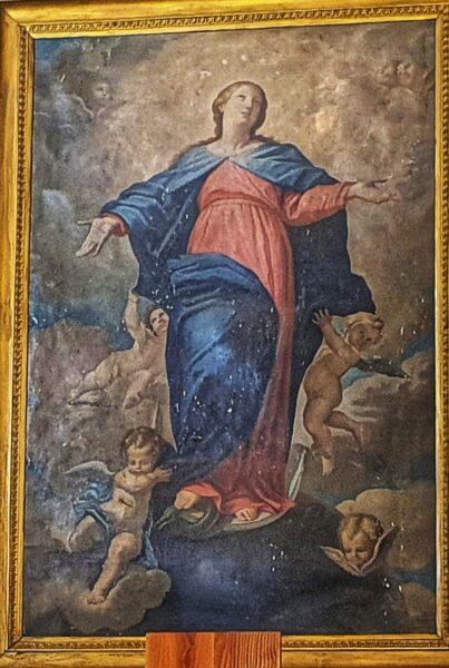 نرى العذراء أثناء صعودها في النفس والجسد رافعة يديها وشاخصة نحو الأعلى حيث الحضور الإلهي وهي في حالة تضرع وصلاة للرب الإله.