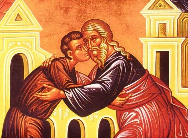 ان مجرد اعتراف الابن الاصغر بخطأه نحو ابيه واخيه نال غفران ، لذلك وقع الاب على عنقه وقبله ، فقبلة الأب لا تدل فقط على محبته القلبية لابنه ، بل مبادرة للمصالحة . فعندما يرى الله اصرار الخاطئ على ترك الماضي والذهاب اليه يتدخل فيغيره ويجدده ، وهذه هي الولادة الجديدة التي تسمى التوبة الحقيقية .