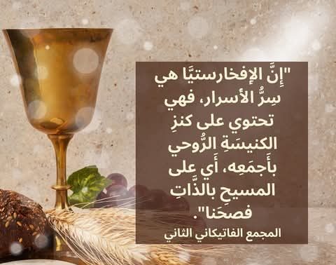 قال يسوع: “أنا خبز الحياة. آباؤكم أكلوا المَنّ في البرية وماتوا. هذا هو الخبز النازل من السماء، لكي لا يموت كل من يأكل منه. أنا الخبز الحي الذي نزل من السماء. إن أكل أحد من هذا الخبز يحيا الى الأبد. والخبز الذي سأعطيه أنا، هو جسدي لحياة العالم”. فخاصم اليهود بعضهم بعضًا قائلين: “كيف يقدر هذا أن يعطينا جسده لنأكله؟”. فقال لهم يسوع: “الحق الحق أقول لكم: إن لم تأكلوا جسد ابن البشر وتشربوا دمه. فلا حياة لكم في أنفسكم. من يأكل جسدي ويشرب دمي، فله الحياة الأبدية. وأنا أقيمه في اليوم الأخير. لأن جسدي هو مأكل حقيقي، ودمي هو مشرب حقيقي. من يأكل جسدي ويشرب دمي، يثبت فيَّ وأنا فيه. كما أرسلني الأب الحي وأنا أحيا بالآب. فالذي يأكلني يحيا هو أيضًا بي. هذا هو الخبز الذي نزل من السماء، ليس كالمن الذي أكله أباؤكم وماتوا. من يأكل هذا الخبز فانه يعيش الى الأبد”. قال يسوع هذا في المجمع وهو يعلم في كفر ناحوم. (يوحنا 6: 48_ 60).