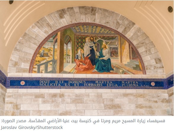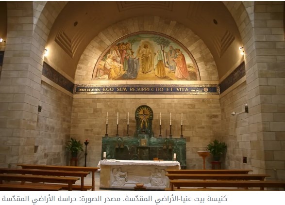 وشرح حزبون أنّ على مذبح الكنيسة نُقِشَ قبر فارغ يحيط به ملاكان، في إشارةٍ إلى قيامة المسيح وصعوده إلى السماء. ورُسِمَت على واجهات الكنيسة لوحات فسيفسائية، تشير إلى الأحداث الواردة في الأناجيل. وهي تُظهر إحياء لعازر، ومريم تدهن قدمَي يسوع بالطيب، وضيافة الشقيقتَيْن ليسوع.