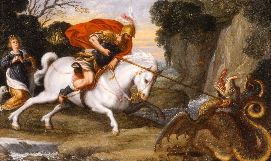 صوَّر الرسامون القدّيس جرجس بصورة فارس مغوار، جميل الطلعة، عالي القامة، يطعن برمحه تنيناً هائلاً و يدوسه بسنابك حصانه و يخلص إبنه الملك من براثن التنين