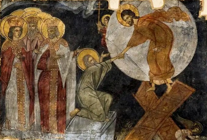 إنَّ القدِّيس كليمنضوس الإسكندري هو أوَّل من يُعبِّر عن هذه الفكرة ولكنَّنا نجدها فيما بعد في كتابات آباء قدِّيسين آخرين كذلك وفي نصوص الخدم الإلهيَّة للكنيسة الأرثوذكسيَّة. يدرس القدِّيس نيقولاوس كاباسيلاس( عاش حوالي القرن الرابع عشر الميلادي ) أيضاً في كتابه ” سبعة مقالات عن الحياة في المسيح ” حول من أخرج المسيح معه من الجحيم.