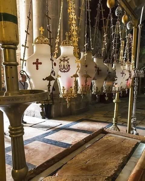 هنا بإذن من بيلاطس البنطي، تمً انزال جسد المسيح عن الصليب، ووضع الرب يسوع على هذا الحجر ثم دهن بالطيب …