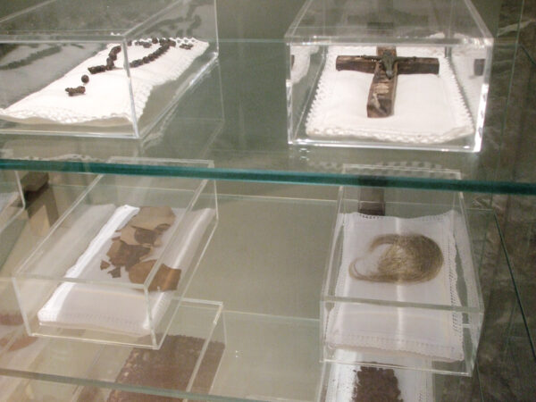 – ثوبه الرهباني (الثوب البني + الحبل الأبيض) مع سبحته التي اعتاد أن يحملها معه للصلاة وقد انبرى صليبها الخشبي لكثرة الضغط عليها خلال الصلاة في أوقات الشدة.