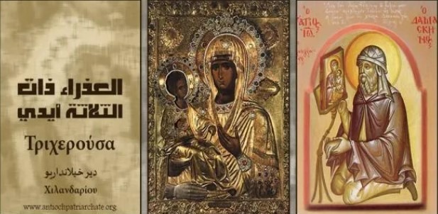 كانت الأيقونة المدعوّة ” ثلاثة أيدي ” للسيدة العذراء، الجوهرة الثمينة للقديس يوحنا الدمشقي، وقد حفظها بشكل خاص بتضرعاته وصلواته داخل بيته في دمشق. هذا كان في بداية القرن الثامن، حيث كان الوليد خليفة العاصمة دمشق 705- 715 م و قد اتخذ في قصره “يوحنا الدمشقي” أميناً استشارياً، أي يشغل مهمة جابٍ، نظراً لمعاشرته الحسنة و البارزة في إطار صلاحيته التي تولّتها عائلته تقليدياً،و نشأت في بداية القرن الثامن هرطقة حرب الأيقونات في مركز القسطنطينية على يد الملك لاون الثالث ملك بيزنطة؛ فتحرك القديس الدمشقي، الذي كان وقتئذٍ علمانيّاً، وانبرى للردّ على كل هرطقة لمحاربي الأيقونات المقدّسة، وكتب كثيراً كما شفهياً، وأنشأ بموقف شجاع ثلاث خطابات ضدّ هؤلاء، ولم يكن أحدٌ غيره يجاهد في هذا الأمر. ولما وصل الأمر لمحارب الأيقونات الملك لاون الذي كان معروفاً بأنّه مخادع و لئيم، وشى بخطاب عند الخليفة ادّعى فيه أنّه من عمل القديس، في حين أنه أمرَ خطّاطاً كان موضع ثقة عنده بتقليد خط القديس في رسالة بُعثت إلى الخليفة الأموي مرفوقة بأخرى بخط الملك ليكشف بها خداع القديس كما ادّعى. ويقول في المزوّرة: “إنّ القديس مستعدٌ أن يساعده ضدّ الخليفة الوليد وأن يسلّم له العاصمة دمشق” ولما وصلت الرسالتان إلى الخليفة، و الخليفة كان يحبّ القديس فاستدعاه وحقّق في أمرالرسالة فأجاب القدّيس: “الخط مشابه لخطي ولكنّي لم أكتب هذا و لم أرَ هذه الرسالة إلّا الآن، لم يصدقّه الخليفة و لم ينتبه أو يشعر بالمكيدة التي حيكت له بالرغم من محبته للقديس؛ فأمر أن تقطع يد القدّيس اليمنى و تعلّق في وسط مدينة دمشق لتكون عبرةً للكلّ.