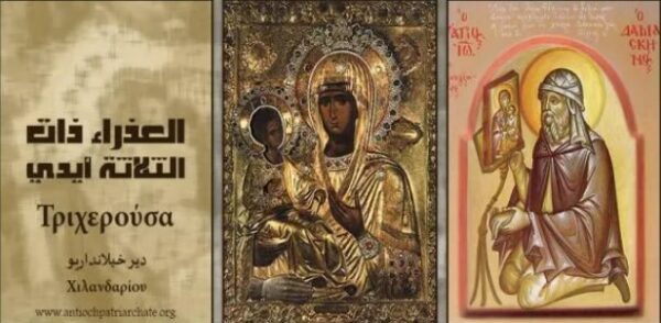 “إنّي أنا مدينتك يا والدة الإله، أكتب لك رايات الغلبة يا قائدة محامية، وأقدّم لك الشكر كمُنقَذَة من الشدائد، لكن بما أنّ لك العِزة التي لا تحارب، أعتقيني مِن صنوف الشدائد حتى أصرخ إليكِ، افرحي يا عروسًا لا عروس لها”.