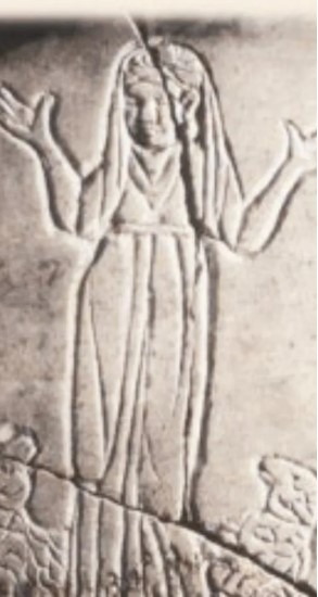 نقش من دياميس روما يصوّر امرأةً مسيحيّةً تغطّي رأسها في القرون المسيحية الثلاثة الأولى. مصدر الصورة: المطران حبيب هرمز