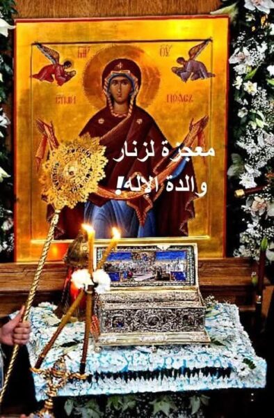 افرحي يا والدة الإله العذراء الممتلئة نعمةً، يا ميناء وشفيعة جنس البشر، لأنهُ منكِ تجسَّد منقذ العالم، وأنتِ وحدك أمّ وبتول، ومبارَكة دائماً وممجَّدة، فتشفعي إلى المسيح الإله، أن يهب السلامة لكل المسكونة.