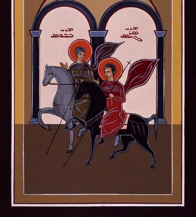المحتفل: أيها القديسان الشهيدان، مار سركيس وباخوس، يا من عرفتما الديانة المسيحية بنعمة الله، فآمنتما بالمسيح، وكنتما، وأنتما قائدان في الجيش الروماني، تُصليان إلى المسيح، بينما رفاقكُما يعبدون الأصنام. ولما وشَيَ بِكُما أَنَّكما مسيحيان، وطُلب منكما أن تُنكرا المسيح وتُقدِّما السجود والذبيحة للأصنام، رفضتُما وأعلنتما أنكما للمسيح وحده تسجدان، وإِيَّاهُ وحده تَعبُدان، مع أبيه وروحه القدوس، فمتما من أجله شهيدين. نسألكما أن تشفعا بنا إلى الرب. كونا لنا مثالاً في الطاعة والشجاعة، وعلمانا أن نتوق إلى السَّماءِ نَظيركُما. وكما أحببتُما المسيح وشهدتما له بجرأة أمام الملوك والحكام، وبذلتما حياتكُما حَبًّا لَهُ، هَكَذَا التَمِسا لنا أَنْ نحبَّه ونَشْهَدَ لَهُ بِكلامنا وأعمالنا أمام جميعِ النَّاسِ. جدِّدا شعبنا المسيحي في هذا الشرق، فينمو الإيمان في قلبه. وكما أن دمكما المسفوك على الفرات عربون عهد جديد وسلام جديد للكنيسة كلها، كذلكَ فَلْيَكُنْ دمكما، للكنيسة اليوم، بذاراً جديدةً لِشَعبٍ جديد وسلام جديد، فنُمَجِد الله معكما إلى الأبد.