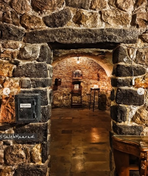 في الزاوية الشمالية الشرقية باب ضيق، بعد دخوله يجد الزائر سُلّماً ذا درجات حجرية صغيرة، يضطر المرء عند نزولها لخفض قامته، لتنقله هذه الدرجات خمسة أمتار في عمق المكان، وتعود به إلى ألفي عام من عمر الزمان. هناك تحت الأرض، تتألف الكنيسة التي هي ـ في الأصل ـ كهف طبيعي من قاعتين، الأولى متطاولة شمالاً وجنوباً، وهي الكبرى ممثلة الكنيسة. والأخرى صغيرة تقع في الزاوية الشمالية الغربية من القاعة الكبرى. أما الأرضية، فهي مبلطة بالبلاط المجزع الكبير بفواصل سوداء.