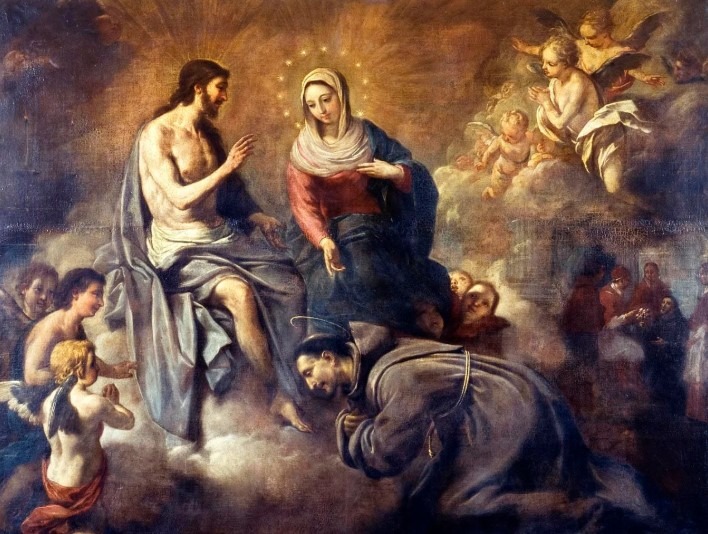 وفي ليلة من الليالي سنة 1216م وبينما كان يصلي في كنيسة سيدة الملائكة وقلبه يذوب حبا حصلت له رؤيا: يسوع ومريم وسط الملائكة حثه يسوع على طلب نعمة التي يرى انها الأنفع لخلاص النفوس.