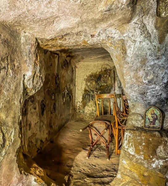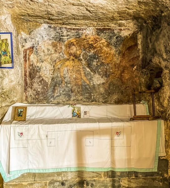 الكنيسة عبارة عن مغارة محفورة في الصخر ذات خوروسين، لعلّ جداريتها الأجمل هي الظهور الإلهيّ.
