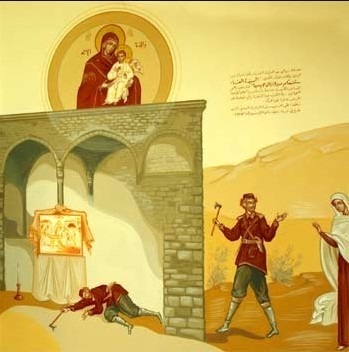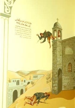 رسم حائطي في الكنيسة لمحاولة إنزال الجرس وتحطيم الأيقونة
