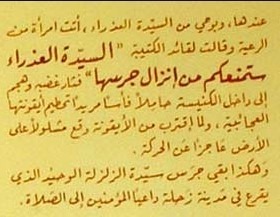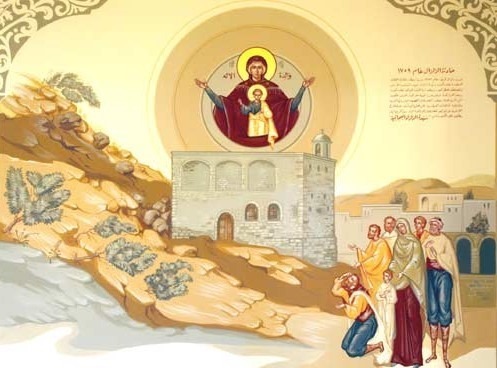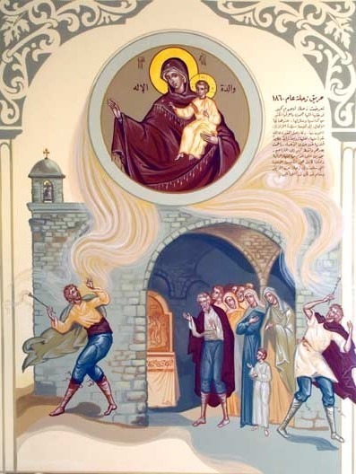 في حوادث العام 1860 احتشد مقاتلون، في محيط مدينة زحلة، لمهاجمتها ودخلوا إليها بالحيلة وأحرقوها. احتمى عددٌ من أبنائها في كنيسة الزلزلة لإيمانهم أنّها ستردع الأعداء وتحمي من يلوذ بها. وعندما وصلت فرقةٌ من المهاجمين إلى باحة الكنيسة وهمّت بالدخول إليها لقتل مَن فيها ونَهْبِ تحفها وحرقها، كانت العذراء مريم لهم بالمرصاد إذ ذرّت الغبارَ في عيونهم، مُحدِثةً سياجًا حول كنيستها حال دون اقتراب الأعداء منها. هكذا سلِمت الكنيسة من الحريق، وسَلِم كلّ من التجأ إليها*.
