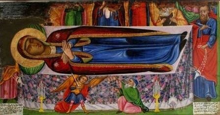 رسم هذه الأيقونة ميخائيل مهنى القدسي عام 1881، وهي أيقونة كبيرة عرضها حوالي 90 سنتمترًا. سنة 1971 أو 1972، احترق قسم من هذه الأيقونة بسبب الشموع الّتي كانت تضاء مقابلها. فأخذها القيّمون على الكنيسة، وعلى قدر معرفتهم أعطوها لأحدهم ليرممها. هذا الأخير قطع القسم العلوي منها وهو القسم المحروق بالإضافة إلى أحد جوانبها. فلم يبقَ ظاهرًا فيها إلا جسد العذراء المسجّى وقسم من الرّسل والجزء السّفلي من السّيّد. وهي أيقونة عجائبية. تُنسب إليها عجائب عدة يتناقل خبرها النّاس.