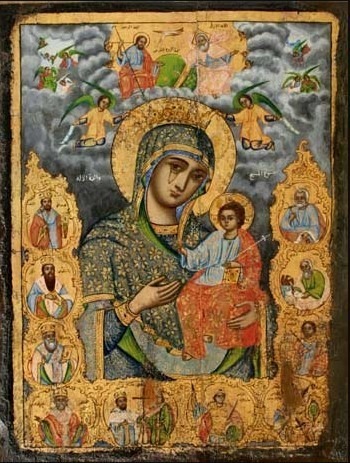 لعلّها أقدم أيقونة في الكنيسة من حيث رسمها وزخرفتها. قبل ترميمها لم يكن ظاهرًا منها إلاّ وجه العذراء، ولكن بعد ترميمها، سنة 2005، وإزالة السّواد الّذي سبّبته الشموع المضاءة مقابلها، بان قدّيسون يحيطون بوالدة الإله الحاملة السّيّد على ذراعها.