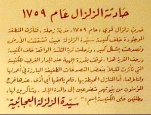 حدث زلزالٌ قويٌّ في العام 1759، غرقت مدينة بيروت على أثره وتضرّرت مدينة بعلبك الّتي كان ما يزال معبدها قائمًا بأعمدته كاملةً مع الهيكل حتّى ذلك الحين. يُذكر أنّ شكلها الحالي صار عليه بعد الزلزال. أما زحلة فكانت بلدةً صغيرةً وكنيسة السّيِّدة كانت أعلى بناءٍ فيها. فلما وقعت الزلزلة تشقّقت الأرض خلف الكنيسة وزحلتِ التربةُ باتجاه الكنيسة، ولمّا تتوقّف إلا بعجيبة بعدما اصطدمت بالكنيسة وطمرت جزءًا من حائطها الغربي. إذ ذاك توقّفتِ الهزّاتُ الأرضية وسلِمت كلّ المنازل من تأثير الزلزال، وأيقن أبناء زحلة أنّ كنيسة السّيّدة حمتهم منه وأوقفتْه، فتوافدوا إليها شاكرين العذراء على حمايتها لهم.