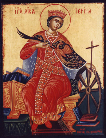 يظهر الى جانب القديسة كاترينا في ايقونتها، “دولاب” و”كرة” و”كتب”.