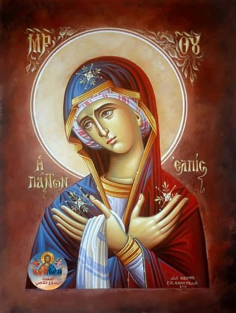 وسائرُ السُّلُطات والرئاسات السماويّة يُباركونَكِ. ونحنُ أيضاً الّذين على اﻷرض، نَهتفُ لكِ: السلام عليكِ، يا ممتلئةً نعمة، الربُّ معكِ. صَلّي ﻷجلنا يا والدة اﻹله، سيِّدَتَنا وملِكَتَنا”
