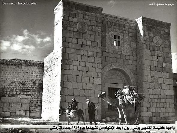 ولما هاجم الفرس بلاد الروم عام 614 م ، داهموا دمشق ودخلوها من هذا الباب وهدموه، ثم احتلوا القدس وسرقوا عود الصليب المقدس من كنيسة القيامة، بعدما أحرقوها، وأخذوه إلى بلادهم. لكن هرقل إمبراطور الروم، حرر المشرق من جديد وانتصر عليهم، واستعاد خشبة الصليب المقدس من بلاد فارس عام 628م، وأعاد بناء ما هدمه الفرس في دمشق، ومن ضمنه هذا الباب، وجعل على طرفي الباب الشعار «المونوغرام» ΧΡ الذي سبق ورآه قسطنطين الملك، واستخدمه، وكان سبباً في إيمانه بالمسيح. وبقي هذا الشعار على جانبي الباب منذ ذلك الوقت إلى يومنا هذا.