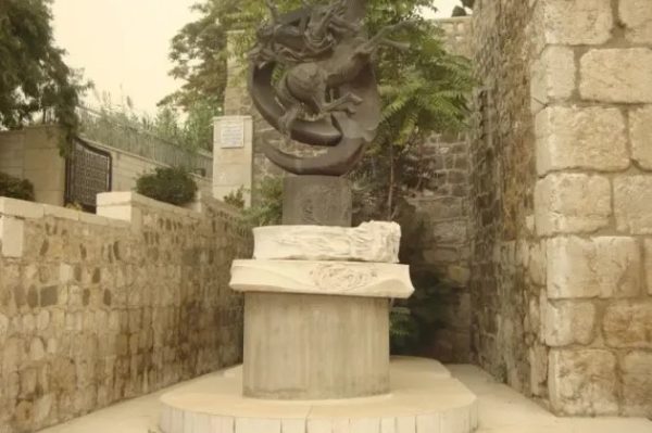 في الجهة اليُسْرى لباب كيسان، يوجد نصبٌ تذكاري للنحّات الإيطالي بيير جيلميني، هو عبارة عن تمثال برونزي للقديس بولس عندما سقط عن ظهر فرَسِه في أثناء ظهور المسيح له. قُدّم هذا التمثال هديّةً من أحد بطاركة روما ليجعل ناظره المؤمن يعيش مشهدًا بصريًّا واقعيًّا لما حدث مع بولس الرسول في ذلك الوقت.