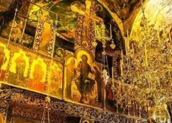 5- عند ترنيم الشاروبيكون (الدورة الثانية)، وإلى ما بعد دورة الكاهن حاملاً القرابين المقدسة “الكأس والصينية” خارجا من الباب الشمالي إلى حين دخوله من الباب الملوكي للهيكل.