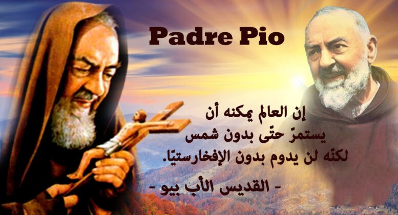 القدّيس بيو، خادم الإفخارستيّا : أيّها الإله، لقد أفهمنا عبدك القدّيس بيو من خلال احتفاله اليوميّ بالقدّاس الإلهيّ كم هو عظيم سرّ الإفخارستيّا في الجماعة المسيحيّة. إمنحنا نعمة أن ندرك عظمة عطيّة إبنك الوحيد الذي أرسلته إلينا، فمات من أجلنا وأعطانا حياته، وها هو في القدّاس يبذل ذاته كلّ يوم لكي يعلّمنا أن لا معنى لوجودنا من دون بذل الذّات.