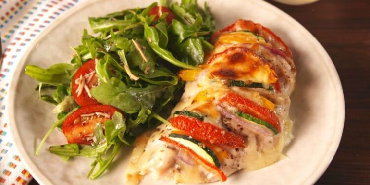 - يقطع الدجاج إلى شقف وسط وتوضع فوق البصل.