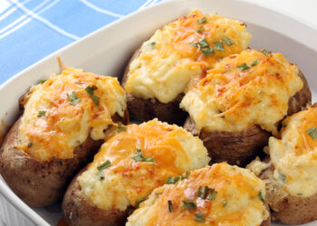 البطاطا المحشوة بالدجاج والفليفلة والجبن المقادير: - حبات بطاطس كبيرة الحجم - ملعقة زيت نباتي - كوب دجاج...