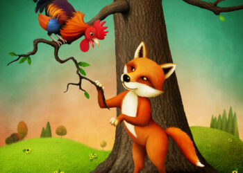 الديك والثعلب وقف الديك بصوته العذب على غصن شجرة يصيح، فتطلع إليه ثعلب جالس تحت الشجرة. - "يا لك من...
